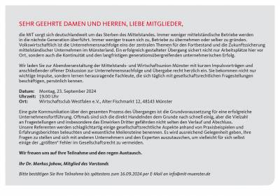 Wir laden Sie daher zur Abendveranstaltung der Mittelstands- und Wirtschaftsunion Münster mit kurzen Impulsvorträgen und anschließender offener Diskussion zur Unternehmensnachfolge und Übergabe herzlich ein.