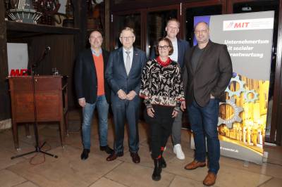 v.l.n.r.: Jan Leiße (1. stellv. Vorsitzender MIT), Hans Hund (Präsident Handwerkskammer), Sabine Deckenbrock (Obermeisterin Innung Modehandwerk), Peter Börgel (Vorsitzender MIT), Stefan Raddant (Obermeister Innung Elektrotechnik), Foto: Till LeckebuschDas Bildungsniveau von Schulabgängern, die kommunale Verkehrspolitik und mangelnde Wertschätzung – drei Themen standen im Mittelpunkt des von der Mittelstands- und Wirtschaftsunion (MIT) der CDU Münster organisierten Abend des Handwerks am 21.03.2023. Rund 70 Vertreter aus Handwerk und Mittelstand, darunter Handwerkskammerpräsident Hans Hund und viele Innungs-Obermeister konnte der MIT-Vorsitzende Peter Börgel im Mühlenhof begrüßen. „Die Interessen der 1.250 Handwerksbetriebe in Münster und ihrer mehr als 10.000 Beschäftigten hat man im Rathaus viel zu wenig im Blick – das wollen wir ändern“, sagte Börgel. Die an diesem Abend entwickelten Vorschläge werde man aktiv in die politischen Diskussionen einbringen.