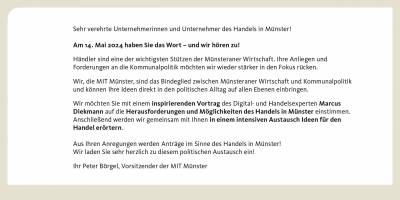 Sehr verehrte Unternehmerinnen und Unternehmer des Handels in Münster!