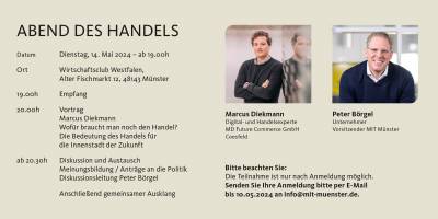 Wir möchten Sie mit einem inspirierenden Vortrag des Digital- und Handelsexperten Marcus Diekmann auf die Herausforderungen und Möglichkeiten des Handels in Münster einstimmen.